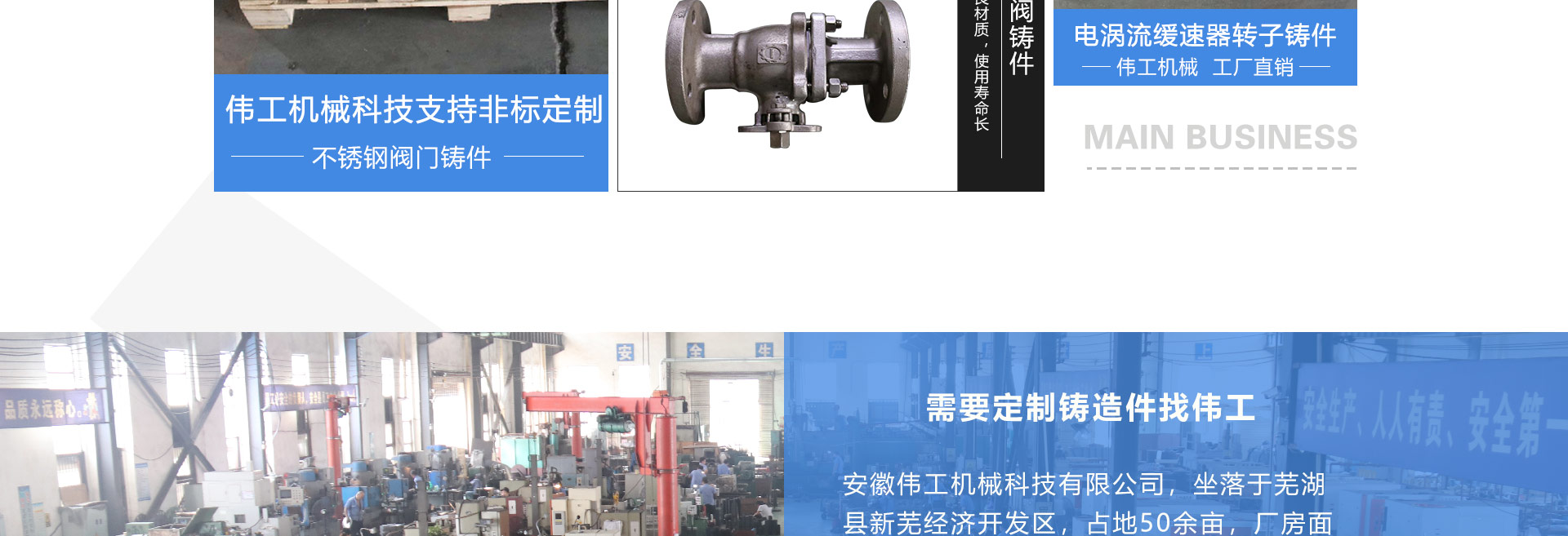 安徽偉工機械科技有限公司,坐落于安徽蕪湖新蕪經濟開發(fā)區,是一家専業從事鑄造產品設計、研發(fā)、生產、銷售于一體的企業,公司為客戶的產品提供多樣的技術支持與設計,公司主要鑄造技術有潮模砂鑄造、硅溶膠精鑄工藝。主要產品有:不銹鋼閥門配件、泵閥配件、汽車配件、工業管道配件、工程機械配件、汽車配件等。材質為:低合金鋼、304、316、316L、鉻鉬鋼、哈氏合金、碳鋼、雙相鋼等。公司已先后通過ISO9001和TS16949等多種體系審核,以完備的管理手段和齊全的檢測設備滿足客戶需求,進的設備,専業的技術,嚴謹的管理,穩(wěn)定的質量。服務客戶,鑄造未來,偉工誠摯的歡迎新老客戶共同商洽合作